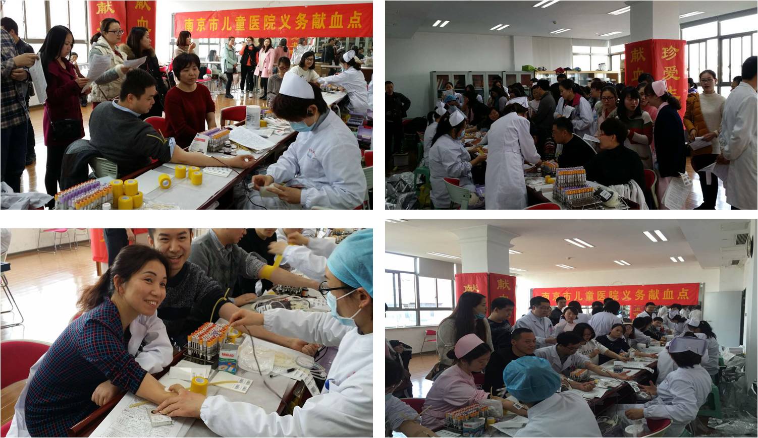 上午8点不到,献血活动便迎来了首轮高潮,志愿者们自发地在会场门口排起了长龙。他们中,有刚下夜班的护士、有休息在家依然赶来的医生……有专家,有领导,有青年医护工作者,也有学生……工作人员忙着为志愿者们登记、指引、测血压、化验、采血,整个过程都井然有序的进行着。顺利通过检查的志愿者自豪地挽起衣袖,伸出胳膊,看着鲜红的血液流入血袋,等待着去挽救一个个鲜活的生命。完成献血的志愿者们纷纷在展板前拍照留念,从他们喜悦的笑容中,从他们自豪的眼神中,我们感受到了儿医人奉献爱心、传递爱心的热情。