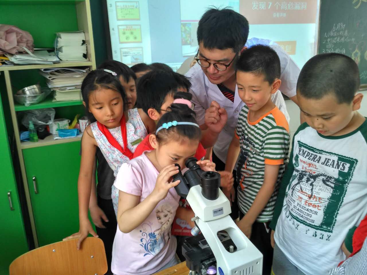 课堂上,检验科青年志愿者还为同学们带去了显微镜,让同学们与细菌来一次“亲密接触”,指导他们在显微镜下观察细菌的样子。在座的每位同学都认真听课,积极参与,课堂气氛活跃,现场互动热烈,让同学们在游戏中学到知识。