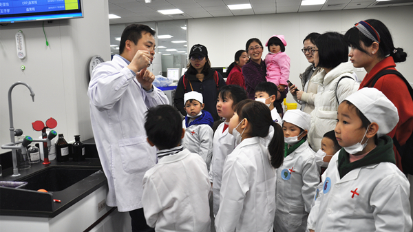20多名“检二代”们穿上医生服装,通过《神奇的微生物》课程讲解,在家长们的指导下使用显微镜看细菌、看血细胞;家长们向孩子们讲述了自己的日常工作,带着他们参观了大型流水线仪器;孩子们还自己动手做实验,在老师们的指导下完成了自己的血型鉴定,了解了血型的秘密。短短半天的时间让孩子们对父母的工作有了更深的理解,对医学也产生了浓厚的兴趣。