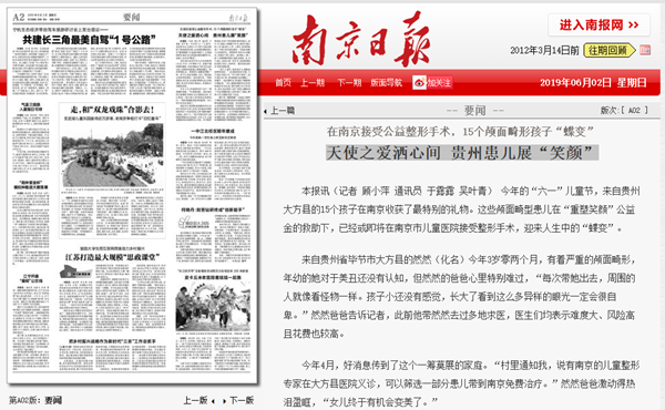 《扬子晚报》——15名贵州山区面部畸形患儿 南京接受爱心手术“重塑笑颜”://epaper.yzwb.net/html_t/2019-06/01/content_515206.htm?div=0