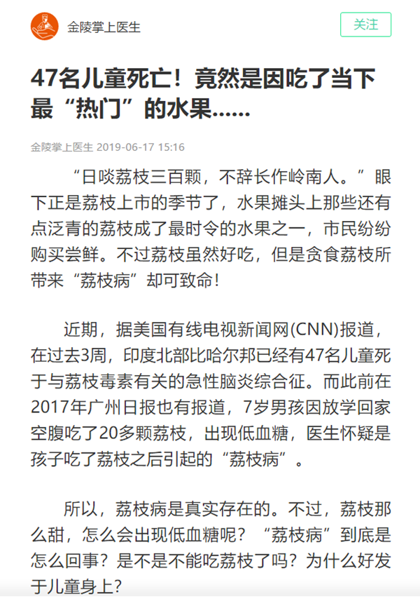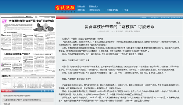 金陵晚报——贪食荔枝所带来的“荔枝病”可能致命://jlwb.njnews.cn/html/2019-06/18/content_164579.htm
