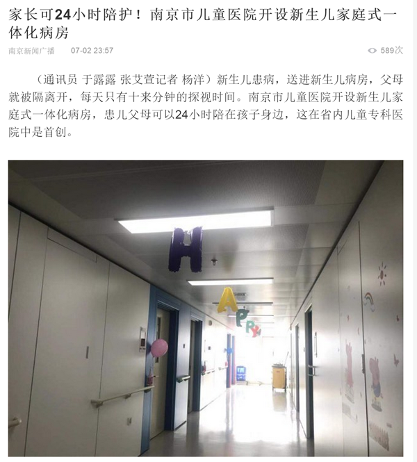 4、《金陵晚报》——市儿童医院开设新生儿家庭式一体化病房 父母可24小时陪孩子://jlwb.njnews.cn/html/2019-07/04/content_165839.htm