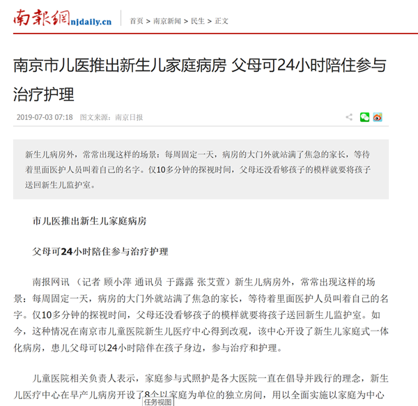 7、南报网——南京市儿医推出新生儿家庭病房 父母可24小时陪住参与治疗护理://www.njdaily.cn/2019/0703/1780805.shtml
