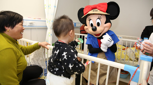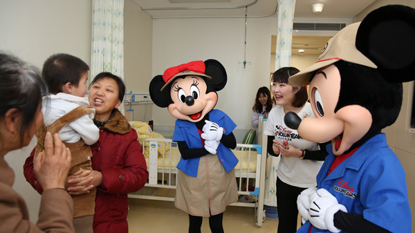 仪式结束后,在病区护士引导下,迪士尼志愿者同米奇、米妮共同来到病房,为住院患儿送去礼物,祝福他们早日康复。