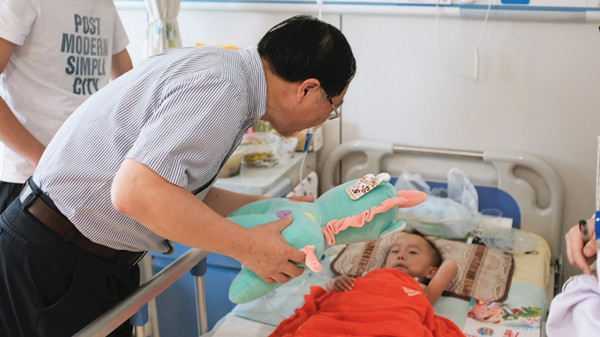 仪式结束后,在医务社工的引导下,自拍偷拍 基金会理事长金福年一行来到病房,为孩子们送上六一节礼物,祝福他们早日康复。